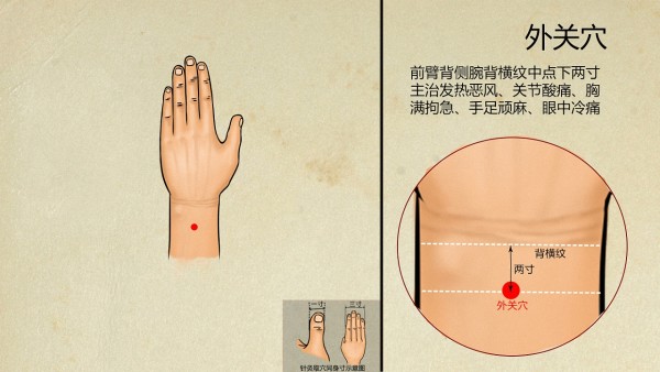 大陵穴位于手掌和手臂交界處,當(dāng)彎曲手腕時(shí),在腕部會(huì)出現(xiàn)橫紋,第2條完整橫紋的中點(diǎn),兩肌腱之間便是此穴。