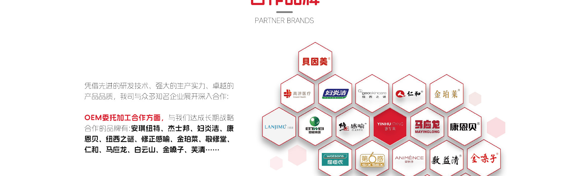 在品牌委托加工合作方面,我司憑借先進(jìn)的研發(fā)技術(shù)、強大的生產(chǎn)實力、卓越的產(chǎn)品品質(zhì),贏得了眾多企業(yè)的關(guān)注及信賴,與國內(nèi)知名企業(yè)展開產(chǎn)品委托加工合作。